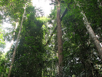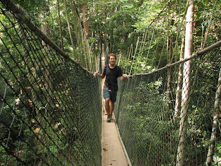 trek do pralesa a zastavit se na Canopy walk, což by měla být procházka v korunách stromů. Vyrazili jsme sami, jelikož zde není nutné si na standartní treky platit průvodce. Začátek stezky byl na druhé straně řeky, nechali jsme se tedy převézt (za 1 MYR) na druhý břeh. Zaplatili jsme vstupné (bohužel si nepamatuju kolik, ale moc to nebylo) a vyrazili po dřevěném chodníku vstříc pralesu. K našemu překvapení chodník pokračoval dál a dál, místy proložen schody nahoru či dolů. Po chvíli jsme potkali jednoho zvědavého makaka - jak se ukázalo, bylo to jediné zvíře, které jsme ten den spatřili. Chodník se vinul dále a my si připadali jako v botanickém pavilonu v ZOO a ne v nejstarším pralese na světě! Asi po 1,5 kilometru jsme došli ke zmíněné Canopy walk. Vystoupali jsme spoustu schodů, znova zaplatili vstupné a vkročili na vratký chodník, zavěšený cca 25 metrů nad zemí. Celá atrakce