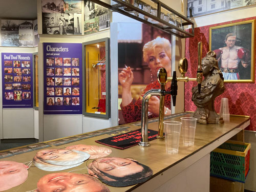 At the far end of the room is the Queen Victoria pub. They've had a bit of fun here and provided facemasks of Peggy, Grant, Kat, Alfie, Pat and Mick so you can pretend to pull a pint in character for selfie purposes, which I can confirm I have seen visitors doing. Again it's not the actual bar but those are genuine Luxford & Copley pumps, that is genuine E20 flock wallpaper and the bust of Queen Victoria is real too. Apparently the show's used more than one bust over the years so this may not be the precise Archie Mitchell murder weapon from 2009.