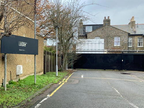After my trip to the museum I crossed the High Street and walked up Clarendon Road for a couple of minutes to see if I could spot the two sets in real life. It's a dead ordinary terraced street but if you look beyond a short modern cul-de-sac, above someone's garage, you can see the rooftops of the flats on George Street on the old set. Meanwhile the new set can be seen up a short private access road very close by, signed 'BBC Elstree Studios' and with a turnstile at the far end where employees go in and out. That's the back of Dot Cotton's old house over the razor wire.