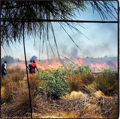 The drama unfolds quickly. The wind is sending the fire downhill, towards our neighbour’s huge expanse of shade-cloth, which starts not 50 m away from our house. Our border beefwood trees aren’t going to be much of a barrier, as they are likely to go up in a blaze themselves once the fire reaches the shade cloth. The fire brigade has been called but is not yet on the scene.