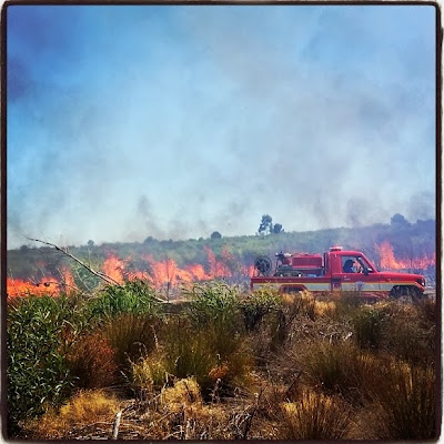 But my eyes are feeling heavy already as we finish the main course. It takes a minute for me to identify the smoke that accompanies the last few mouthfuls. Burning custard, no...not toast burning...not the oven left on...the bonfire smell is an immediate warning bell in our dry summer landscape.