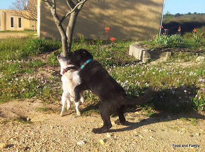Max, my sister-in-law’s dog started off playing wildly with him and to start off with was top dog, but he lost some of his ebullience when George quickly grew bigger than him and started rolling him over instead. They’ve worked out an equilibrium now.