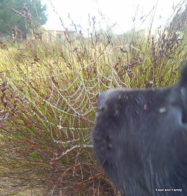 | "So much interesting stuff," as he wipes out the pretty dew spangled cobweb I was photographing! |