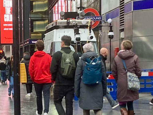 This time it was a white van rather than red, this time with a single pole supporting at least four cameras, but the intended outcome was the same. I presume this deployment was live because six police officers were standing around on duty, in two groups of three, ready to leap into action on a positive identification. But I didn't see a sign anywhere, perhaps because the crowds milling around were blocking it or perhaps because it was pointing a different way. I was especially uncomfortable at the lack of notification, if indeed it was live, as if this were a trap they were hoping people wouldn't notice.