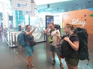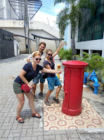 Central Market. Těžko to popsat, ale je to opravdu něco mezi luxusním nákupním centrem a vietnamskou tržnicí. Dá se tu sehnat všechno možné i nemožné, my hledali celkem obyčejné pohledy. Byli jsme totiž líní a za celou dobu jsme nekoupili ani jeden pohled. Nastal tedy panický záchvat, že musíme na 100% něco poslat, takže cíl byl jasný. Pohledů byla všude hromada, nebyl tedy problém jich pár vybrat a nakoupit známky. Prošli jsme ještě kus obchoďáku a vyšli do druhého patra na oběd. Náhodně jsme vybrali "restauraci" a zapadli ke stolu. Docela mi to tam připomínalo jídelní koutky v našich velkých nákupních centrech. Při objednávání pití jsme paní požádali o propisku. Nevypadala, že chápe, co chceme, tak jsme si ji vzali z pultu a sledovali reakci. Vypadala, že jí to nevadí. U jídla jsme napsali hromadu pohledů a po obědě sešli dolů a hledali východ. Narazili jsme na budku s informacemi, tak jsme se rovnou zeptali, kde je schránka - prý venku. Před východem stála červená věc, která vypadala jako odpaďák, ale doufali jsme, že je to opravdu schránka. Dokonce vzniklo i památeční foto vhazování pohledů, aby nám případně všichni uvěřili. Vrátili jsme se do Birdnestu pro věci a zavolali si Uber na letiště.