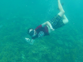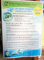 Kupodivu jsme spali až do půl 11, protože na ostrově byl neuvěřitelný klid. Vykopali jsme se z postele, posnídali instantní nudle, kafe 3v1 a začali balit. Měli jsme se stěhovat do slíbených chatek. Šli jsme se tedy zeptat a zatím byla uklizená a volná jen jedna. Při té příležitosti rovnou padl dotaz na šnorchlovací výlet. Slečna z recepce nám rozpačitě sdělila, že výlety se zamlouvají den předem. Na dnešek plánovaný nebyl a tudíž nemá nikoho, kdo by s námi jel. Zklamaně jsme si šli hodit věci do jedné chatky a přemýšleli, co budeme dělat. Za chvíli slečna přiběhla, že prý sehnala týpka, co nás na ten výlet vezme. Domluvili jsme si spicha ve 2 hodiny u recepce a těšili se na potápění. Mezitím jsme zaskočili do stejné restaurace jako včera na lehký oběd. Potom jsme dostali klíče i od druhé chatky a konečně jsme byli plně ubytovaní. Ve dvě na nás čekal kapitán s malým motorovým člunem a se šnorchly. Ploutve prý nepotřebujeme, protože tam nejsou žádné proudy. Měli jsme plavky a tričko, abychom se vyhnuli spálení a vzali jsme samozřejmě i kamery. První zastávka byla Fish garden, místo opravdu plné ryb. Naskákali jsme do vody a rozplavali se všemi směry. Nádherné korály, barevné ryby, průzračná voda, prostě paráda. Já po chvíli zahlédl na dně rejnoka, ale nestihl