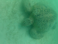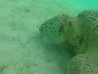 karetami obrovskými, které se připlouvají do teplých vod kolem ostrova napást mořské trávy. Plavali jsme kolem lodi a kapitán na nás zavolal vždy, když nějakou zahlédl při vynoření. Želvy vydrží pár minut u dna a pak se vynoří nadechnout. Pod námi se nezdály tak velké, ale když se kolem nás vynořovaly, tak nám spadla čelist (ne doslovně, měli jsme v puse šnorchl 😀). Některé měly na délku určitě přes metr, byly prostě