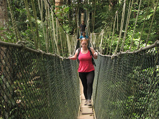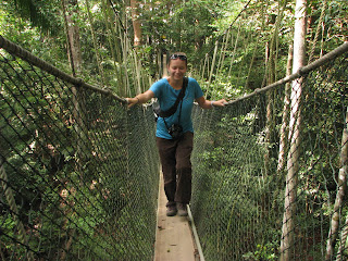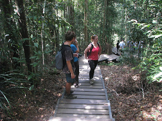 trek do pralesa a zastavit se na Canopy walk, což by měla být procházka v korunách stromů. Vyrazili jsme sami, jelikož zde není nutné si na standartní treky platit průvodce. Začátek stezky byl na druhé straně řeky, nechali jsme se tedy převézt (za 1 MYR) na druhý břeh. Zaplatili jsme vstupné (bohužel si nepamatuju kolik, ale moc to nebylo) a vyrazili po dřevěném chodníku vstříc pralesu. K našemu překvapení chodník pokračoval dál a dál, místy proložen schody nahoru či dolů. Po chvíli jsme potkali jednoho zvědavého makaka - jak se ukázalo, bylo to jediné zvíře, které jsme ten den spatřili. Chodník se vinul dále a my si připadali jako v botanickém pavilonu v ZOO a ne v nejstarším pralese na světě! Asi po 1,5 kilometru jsme došli ke zmíněné Canopy walk. Vystoupali jsme spoustu schodů, znova zaplatili vstupné a vkročili na vratký chodník, zavěšený cca 25 metrů nad zemí. Celá atrakce