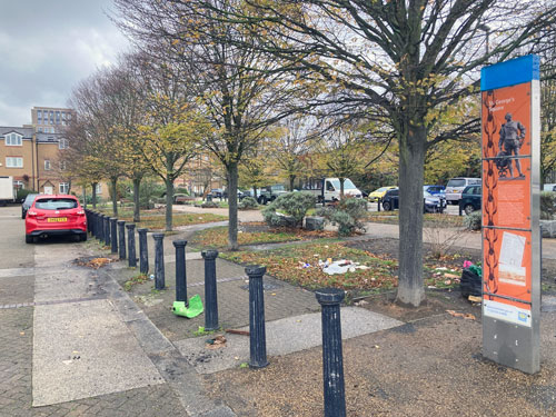 It comprises a long rectangular open space, securely bollarded to deter joyriders, with an avenue of hornbeam trees down the centre. Originally it was all paved but around 15 years ago the council decided to soften the vibe by replacing the outer stripes with lawn and shrubbery. The grass is now pretty threadbare, in some places just mud, and the bushes have shrunk back like receding gums. The benches hold little appeal on a dank day in November but must still be used because an avalanche of bottles, pizza boxes and empty laughing gas canisters tumbled around the litter bins. A passing dogwalker looked at me with a look of despair suggesting she wasn't impressed either.