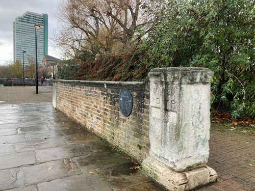 What seeps out here beneath a low concrete slab are the slurried waters of one of London's lost rivers, the Earl's Sluice, a waterway with a considerable geographical significance. Between here and South Bermondsey station it marks the approximate dividing line between the boroughs of Southwark and Lewisham, and prior to 1899 marked the precise boundary between Surrey and Kent. The Surrey Docks were the other side, obviously, and what's now Deptford Wharf was somehow once part of the same county as Canterbury and Dover. A few metres upstream is the boundary stone that used to grace the last bridge across the Earl's Sluice, delimiting St Mary's parish Rotherhithe and St Paul's parish Deptford. But the modern sewer now ends marginally in former Kent, and my understanding is that St George's Square is an undeveloped stripe to avoid building on the mucky tunnel underneath.