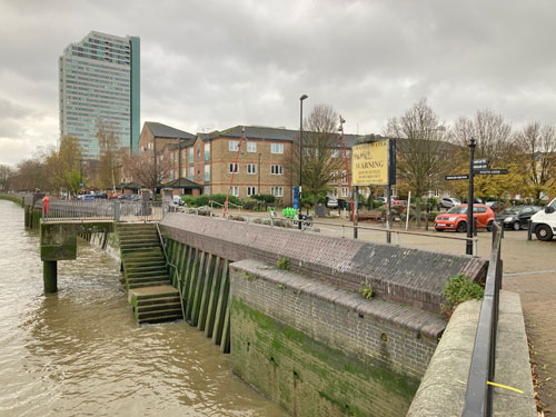 What you will find is the site of an even older relic called St George's Stairs, one of several sets of steps in tidal London providing public access to the Thames. The staircase here is plainly a modern replacement, being slippery concrete rather than slippery timber, and because I arrived near high tide merely led down into turbulent water. I know from previous visits that a small beach opens up at low tide where beachcombing is possible, though perhaps not advised because, as a large yellow sign facing the river duly warns, Sewer Outlet 30 Metres From This Board.