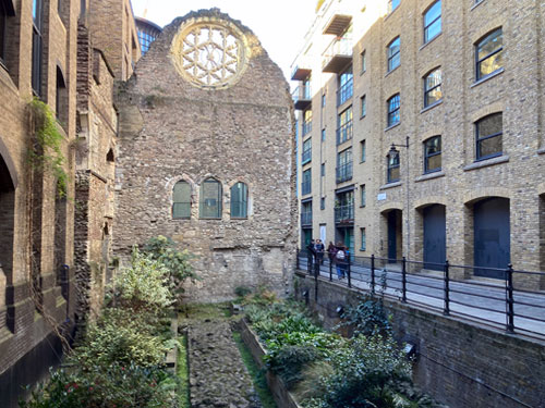 The best known tenant here is Hawksmoor, the premium steak restaurant, who moved into the converted fruit warehouse in 2016. Patrons enter at the front on Winchester Walk and order £57 rib-eye with a £7 side of chips, or perhaps a renowned Sunday roast for under thirty quid. As feasts go it's decent but a mere echo of the grand banquets once held here in the bishop's palace, for example at the wedding of King James I of Scotland to Joan Beaufort in 1424. Meanwhile Hawksmoor's uncooked flesh gets delivered round the back in Winchester Square, which continues on its long decline from prestigious noble courtyard to somewhere all the rubbish gets chucked out after service. Ancient, but no longer distinguished.